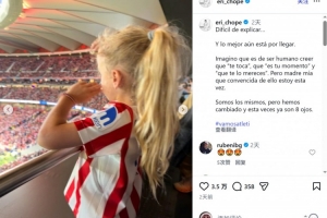 国王杯决赛,马竞点球大战不敌皇家社会,无缘冠军。埃里卡·乔佩雷纳社媒晒出带着孩子观赛的照片,配文:“很难解释……而最美好的尚未到来。